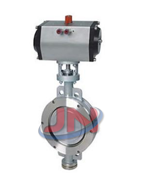 三、D673H气动对夹式硬密封蝶阀工作原理: D673H气动对夹式硬密封蝶阀的密封原理利用偏心结构,做到了阀门启闭时蝶板与阀座间几乎无磨擦现象发生。阀杆的扭矩通过蝶板直接传递至密封面,从而杜绝了打开普通阀门时所常见的跳跃现象。这意味着偏心蝶阀几乎可以从0开度开始即进入可调控区域,直至90开度。其正常调控比是一般蝶阀的2倍以上,调控比最高可高达100:1以上。这为偏心蝶阀作为调控阀使用创造了良好的条件。
